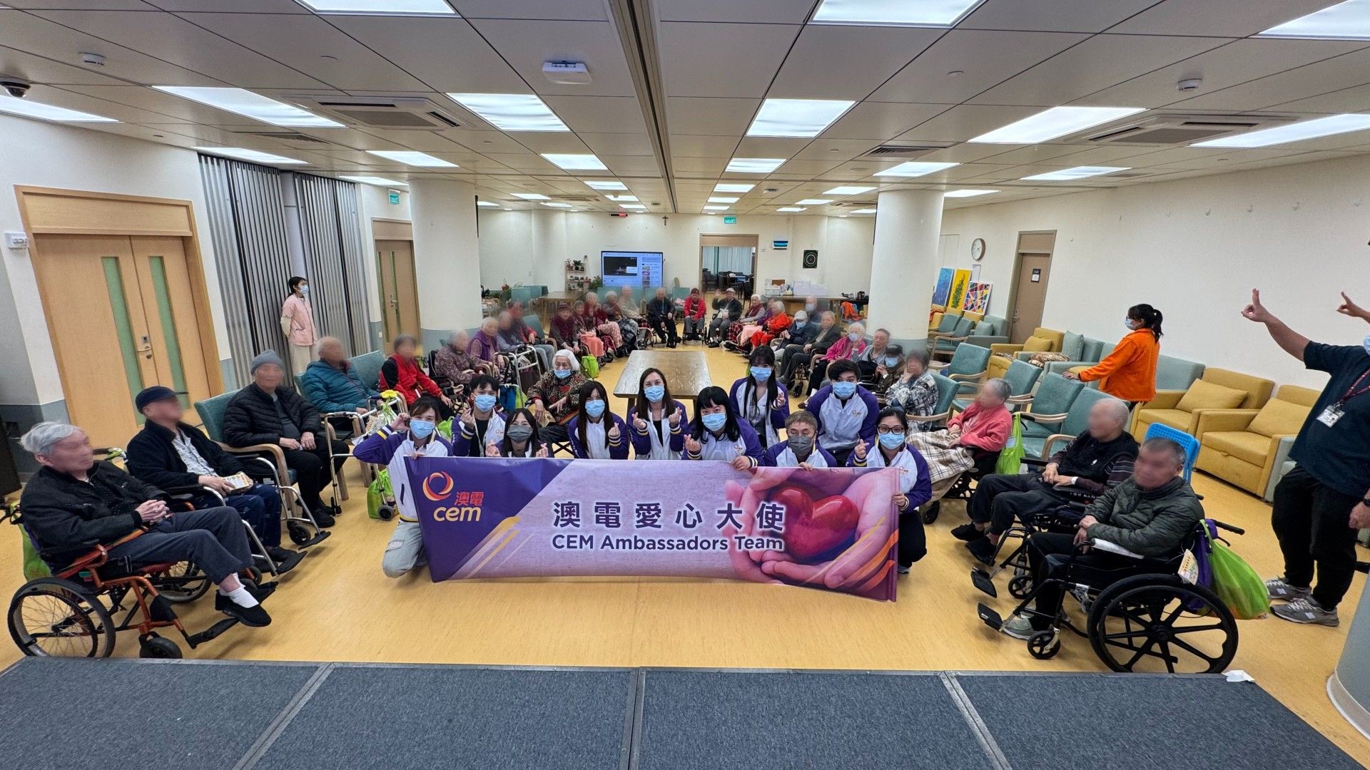 Para além da doação de artigos, Hellen Lok, Directora da Direcção de Recursos Humanos e Sustentabilidade, e Jaclyn Iun, Gestora Sénior do Gabinete para os Assuntos Regulatórios e Comunicação Empresarial da CEM, acompanhadas por 8 Embaixadores da CEM, visitaram recentemente 30 idosos no Complexo de Serviços de Apoio ao Cidadão Sénior Retribuição. Os Embaixadores conversaram calorosamente com os idosos, ouvindo as suas histórias de vida e experiências, e participaram em jogos interactivos, enchendo o local com um ambiente alegre. Os Embaixadores prepararam também algumas lembranças para transmitir os seus sinceros cumprimentos e preocupação aos idosos residentes, lembrando-os de se manterem quentes e de cuidarem bem da sua saúde.