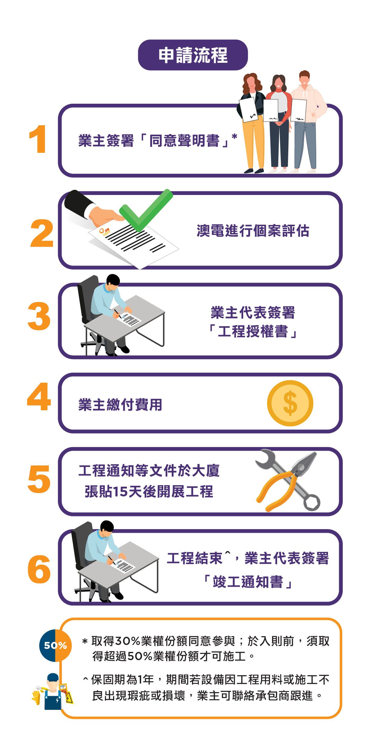 收到邀請函的業主,須先委任一名業主代表,並取得至少30%業權份額(以房屋局提供的大廈業主名冊為準)的業主簽名同意參與計劃,即可啟動申請流程。在澳電向土地工務局提交入則申請前,同意參與的業權份額須超過50% 。