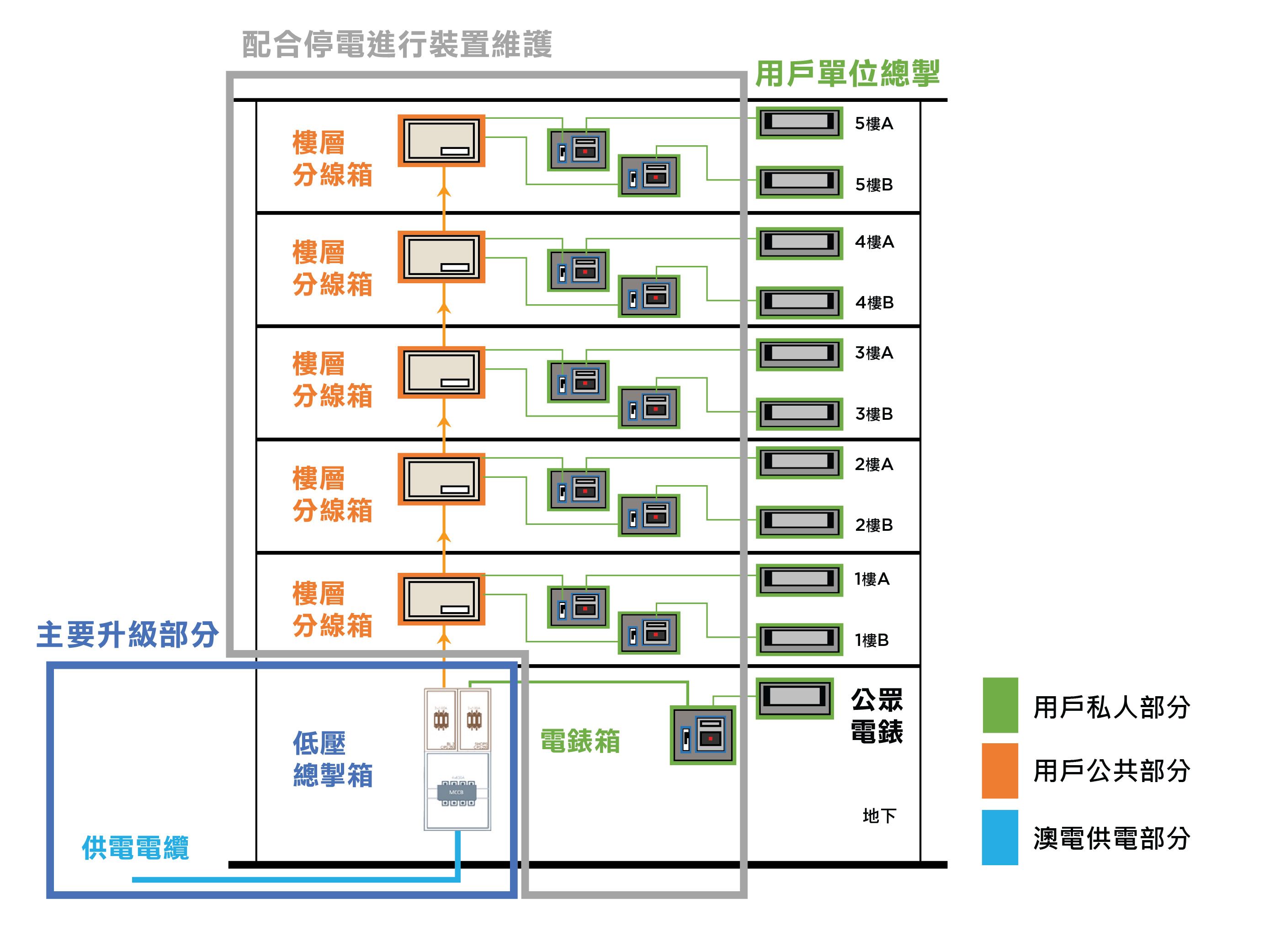 資助工程範圍主要為大廈低壓總配電櫃/總掣箱的更新/升級工程,不包括大廈公共電力裝置(電錶箱、上升總線及上升線分線箱),亦不包括由電錶後至客戶室內的部份,以及大廈內任何最終用電設備。