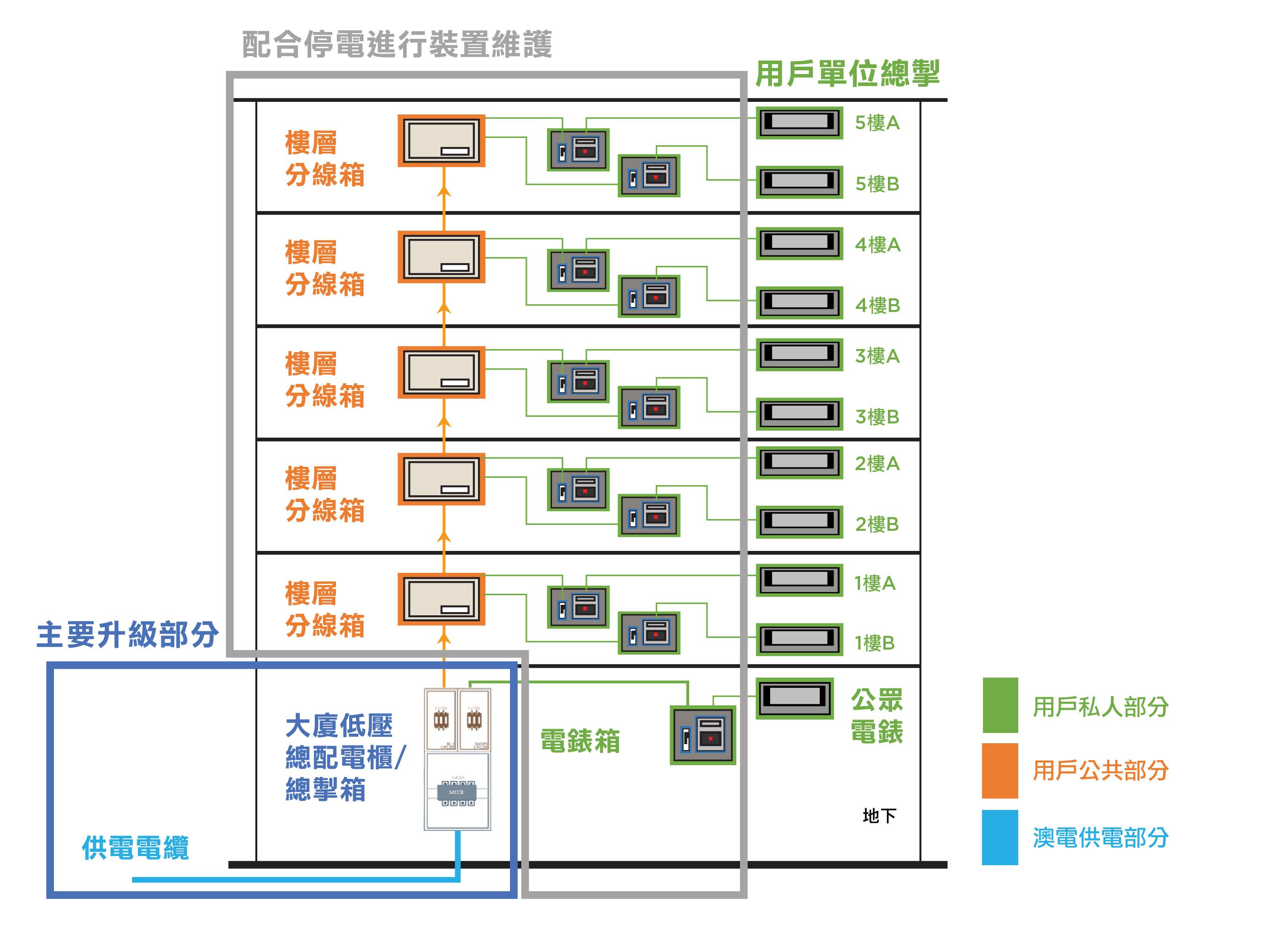 本計劃不包括由電錶後至客戶室內的部份,以及大廈內任何最終用電設備。