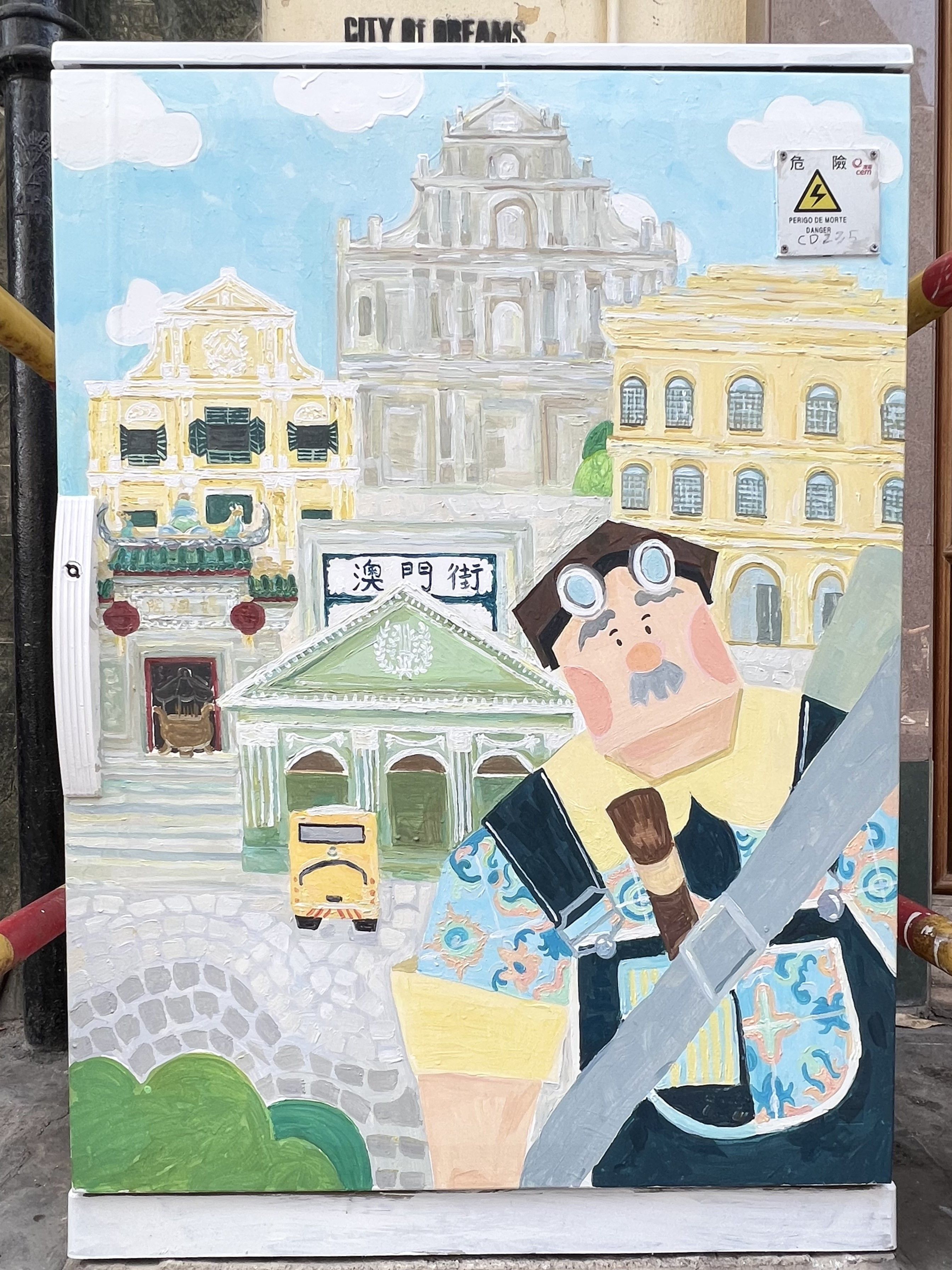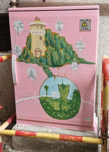 ![]() | O叔帶你遊澳門 - 林佳蔚 作品採取了2個構圖,其一為以第一人稱的視角帶領觀眾遊歷澳門,其二添加了澳門的非遺文化元素。通過將澳門的非遺文化和歷史建築相融合,在電力設施上展示了澳門多元文化交融的魅力,呈現了澳門的文化獨特性。希望更多人路過時可以與澳門文化和建築元素產生情感共鳴,認同並傳播澳門文化。 |