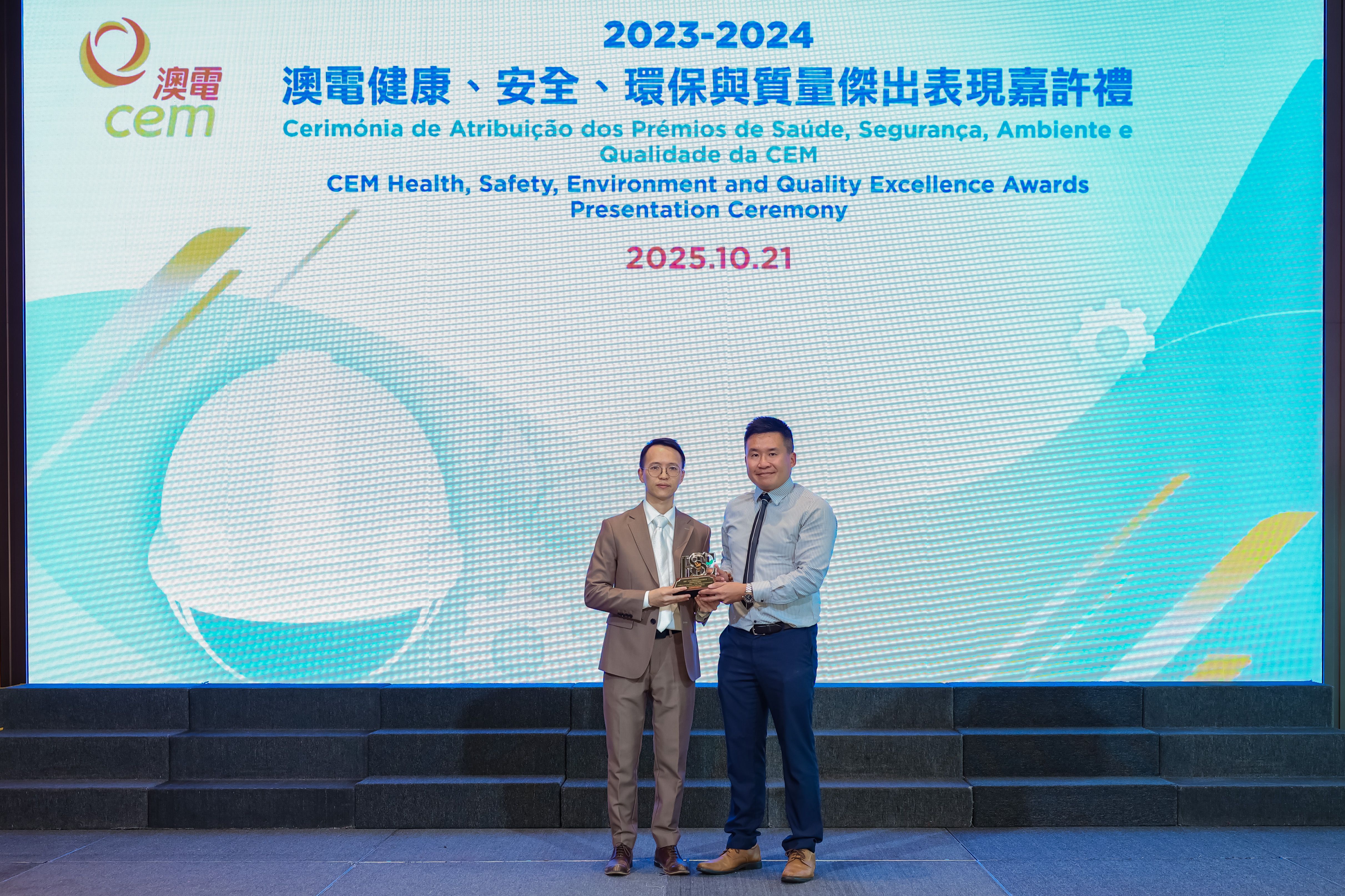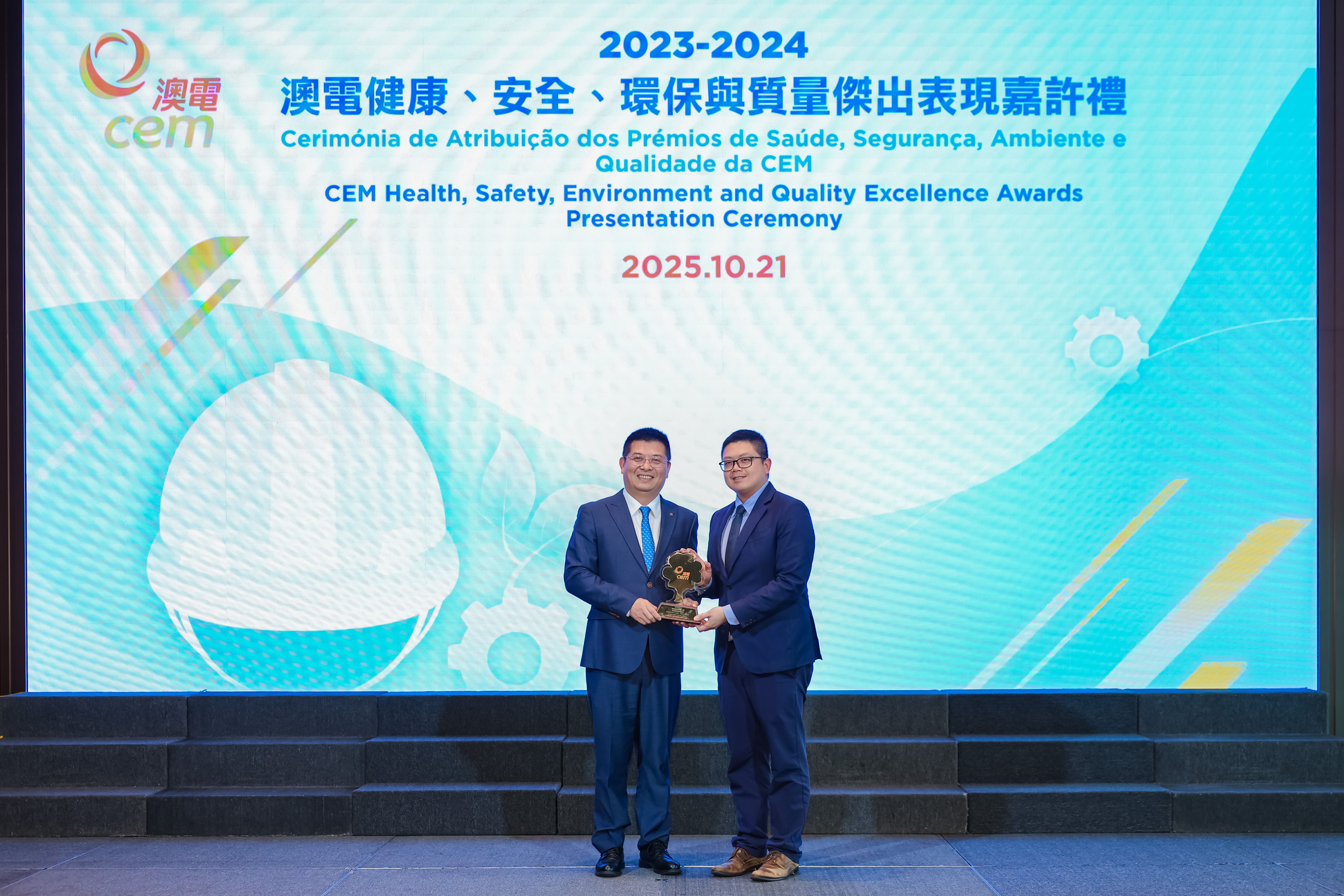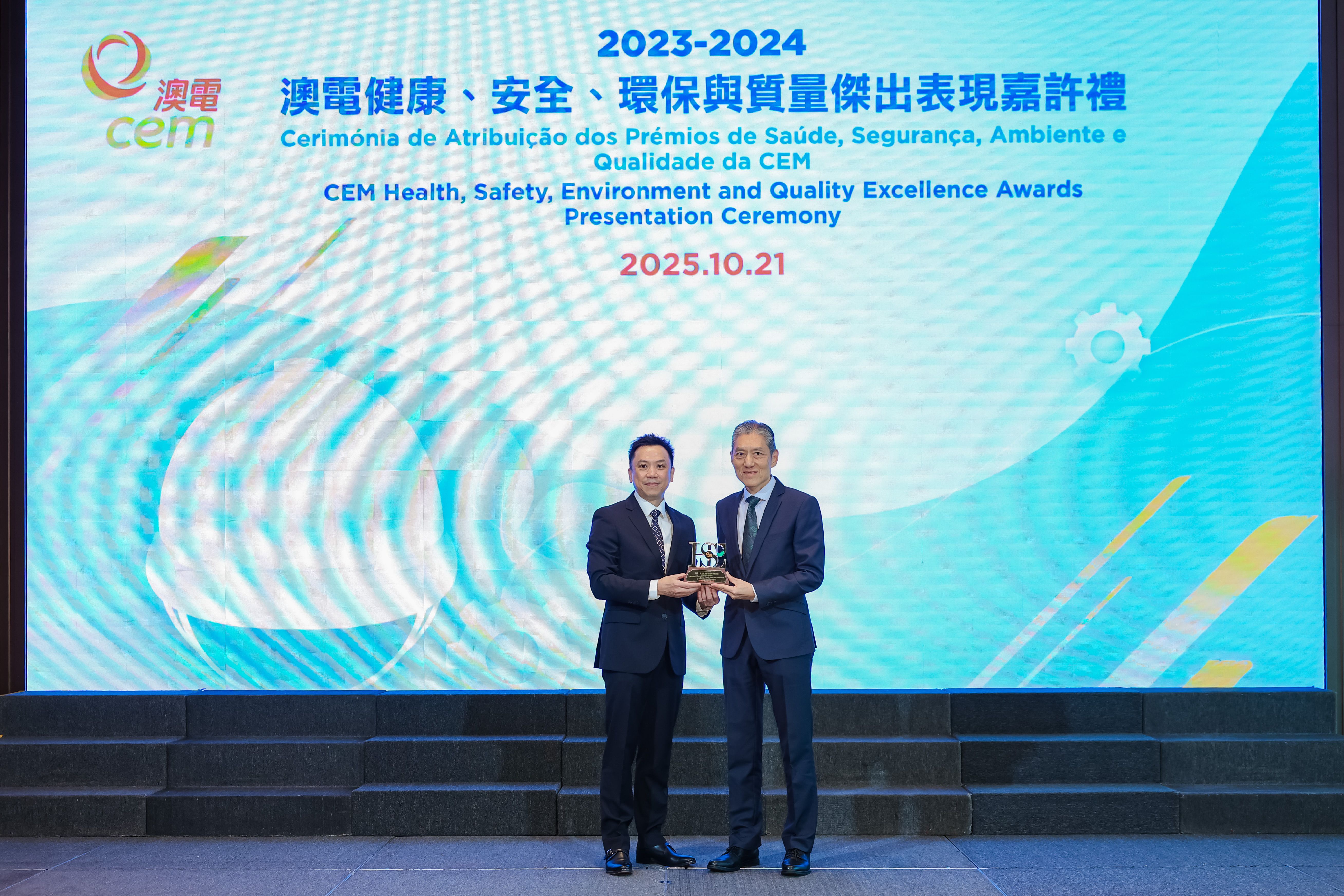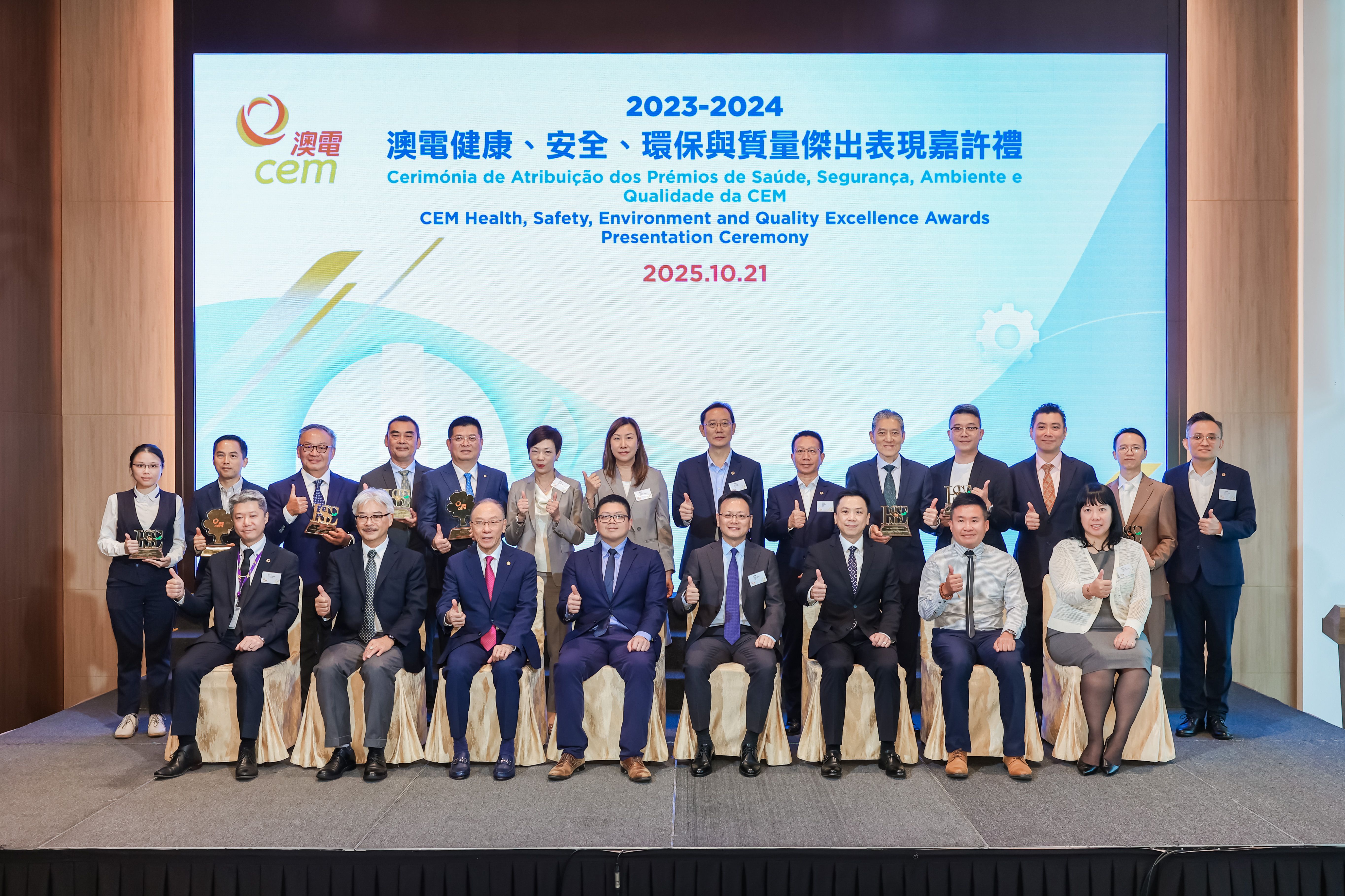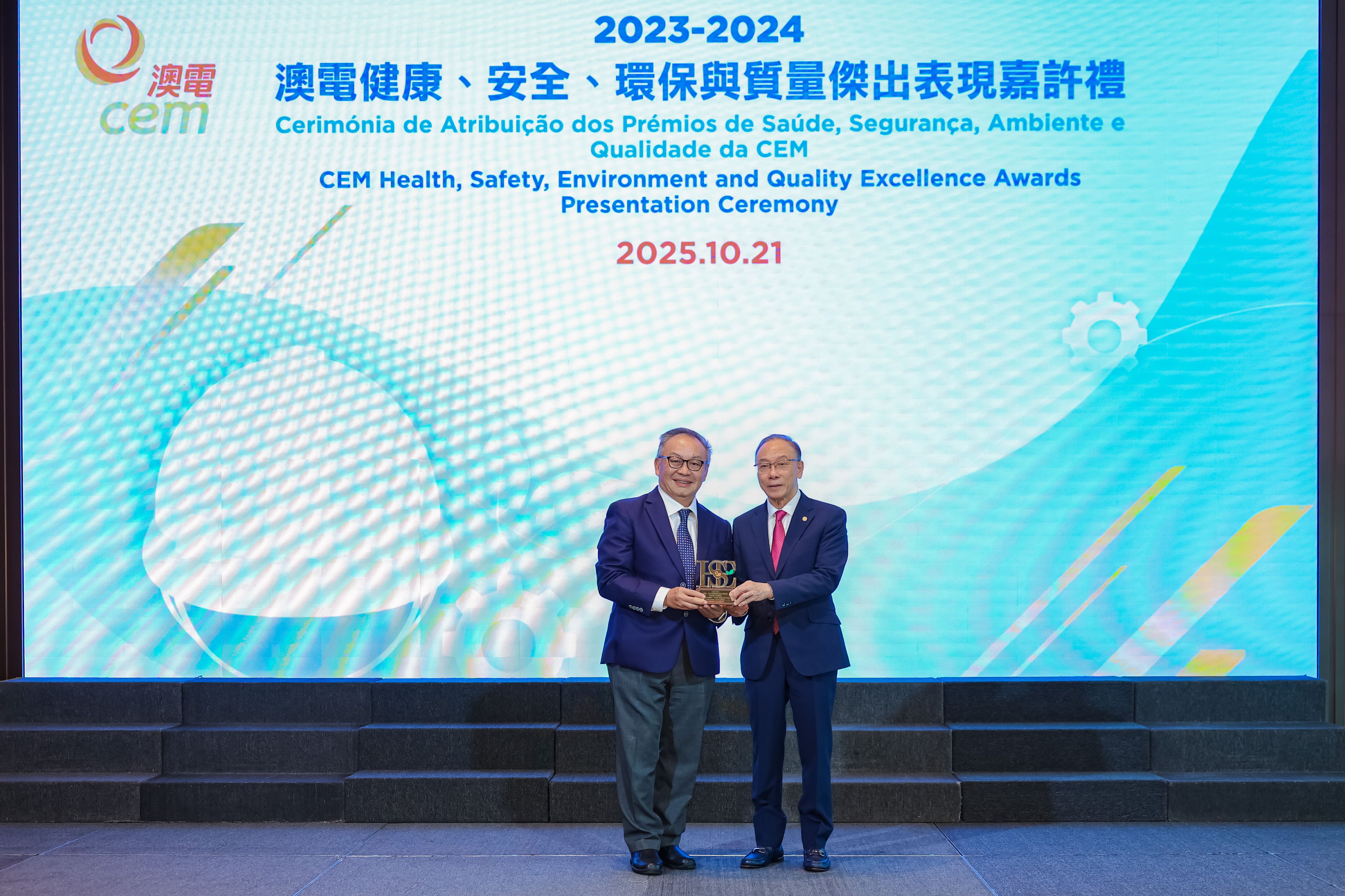 由澳門電力股份有限公司 (澳電) 主辦的「2023/2024健康、安全、環保及質量傑出表現獎」嘉許禮於今日假澳門旅遊塔舉行,藉以表揚承建商及供應商在健康、安全及環保範疇作出的卓越表現。出席嘉許禮的主禮嘉賓包括勞工事務局副局長陳俊宇、環境保護局能源業發展及管理廳廳長盧深昌、電力客戶諮詢委員會主席黃國勝、澳門職業安全健康協會理事長高俊雄、澳電執行委員會主席梁華權。是次獎項的評審團成員則由勞工事務局職業安全健康廳高級技術員蘇國輝、環境保護局能源業發展及管理廳高級技術員周俊宏及澳門職業安全健康協會理事長高俊雄擔任。